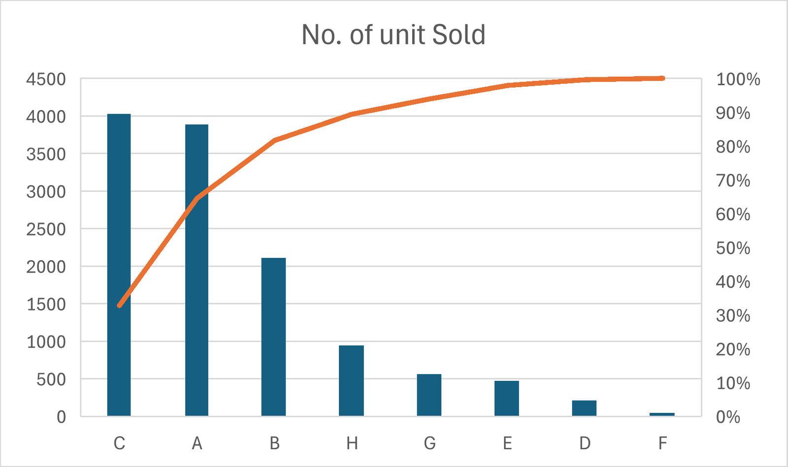 In the example above, if we trace the point where orange line is at 80% in the diagram, we would find that Product C and Product A is residing at the left side of the point. What it means is that Product C and Product A make up 80% of the sales, and this is very handle information for the analysis. From the result, the Six Sigma team may continue to ask why Product C and Product A are selling well and why the others are not.