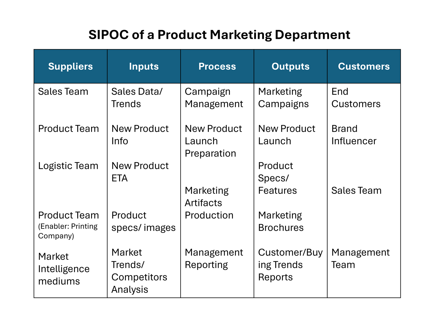 For the example given above, the scope for the SIPOC exercise is defined to be for the Product Marketing Department of a company.