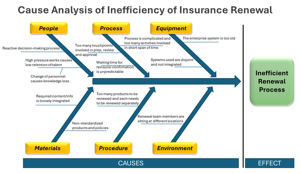 • Fish spine/bone – is the causes of the problem, and connected to 6 different branches each representing a category of the causes of the problem. They are: